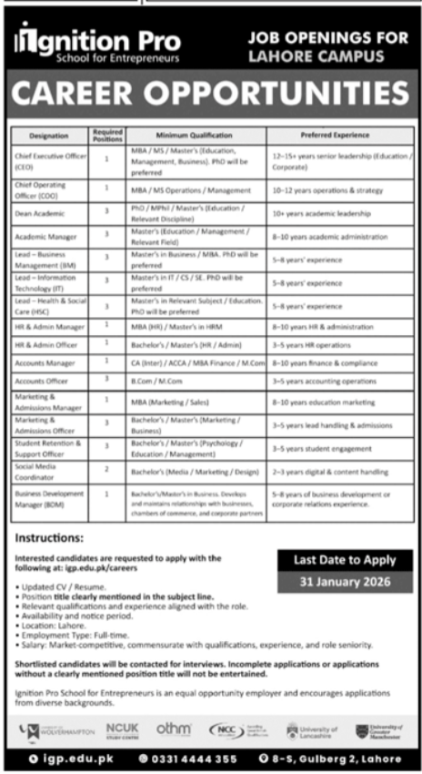 Ignition Professional Faculty for Entrepreneurs is searching for candidates for following posts as per job commercial printed in each day Jang Newspaper of January 5, 2026 for location Gulberg 2 Lahore, lahore Punjab Pakistan:
