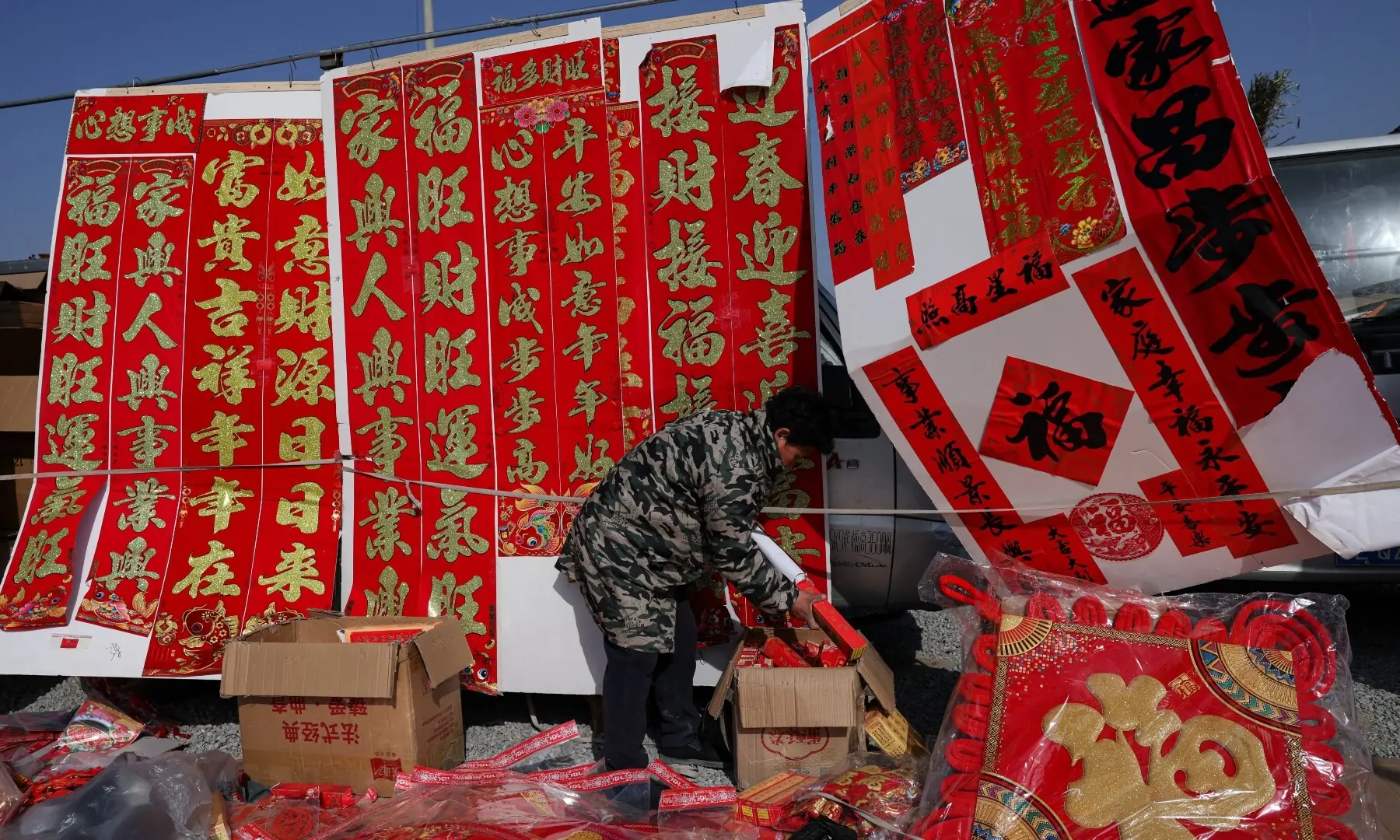 A vendor promoting Spring Competition ornaments works at an outside market forward of the Lunar New 12 months, in Beijing, China February 10, 2026. — Reuters