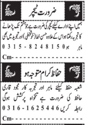 Non-public Faculty jobs commercial dated about 14 January 2026 in each day Jang Newspaper invitations utility for the vacant submit of quran trainer, trainer, calligraphy trainer and hafiz e quran in Quetta, quetta Balochistan Pakistan. Bachelor and Intermediate and so forth. instructional qualification can be most well-liked.