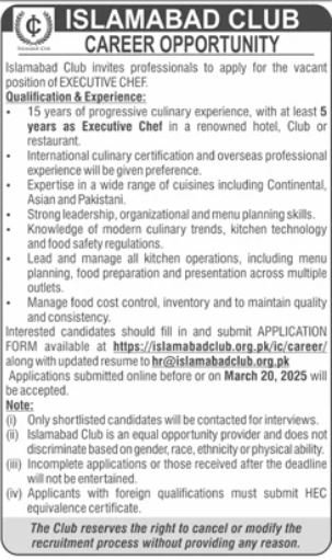 Islamabad Membership Islamabad, islamabad Islamabad Pakistan invitations functions from eligible candidates for the put up of govt chef as per commercial of March 5, 2026 printed in day by day Jang Newspaper. Intermediate and Bachelor and so forth. instructional qualification can be most well-liked.