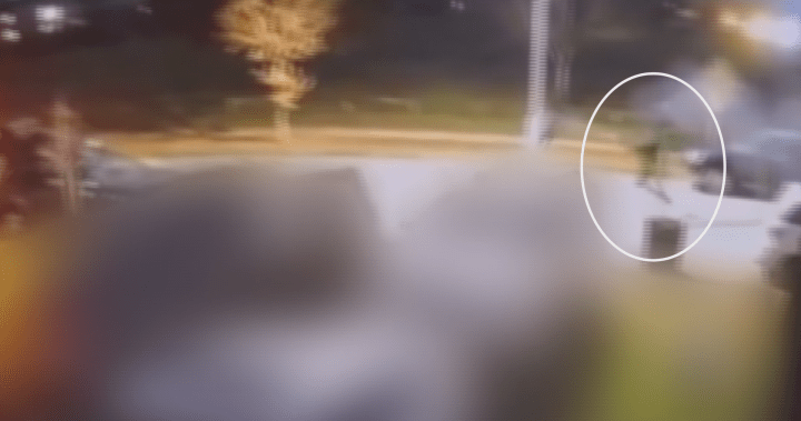 Video reveals an individual capturing a gun whereas working after a automobile. Just a few seconds later, extra gunfire erupts because the determine runs again