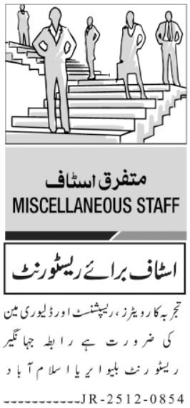 Vacant posts together with supply man, receptionist and waiter are introduced in Restaurant Blue Space Islamabad, islamabad Islamabad Pakistan as per 1 January 2026 commercial in day by day Jang Newspaper. Most popular Schooling is Matric, Intermediate and Center and many others.
