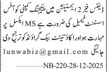 Packaging Firm is in search of candidates for following posts as per job commercial revealed in day by day Jang Newspaper of December 29, 2025 for location Defence Backyard Karachi, karachi Sindh Pakistan: