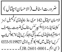 Al Ihsan Hospital is on the lookout for candidates for following posts as per job commercial revealed in day by day Jang Newspaper of January 5, 2026 for location Murree Street Rawalpindi, rawalpindi Punjab Pakistan: