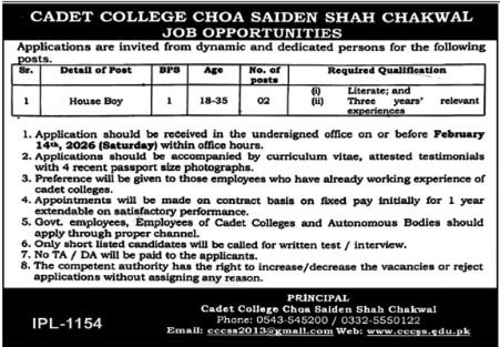 Cadet School is on the lookout for candidates for following posts as per job commercial printed in each day Nawaiwaqt Newspaper of January 31, 2026 for location Chakwal, chakwal Punjab Pakistan: