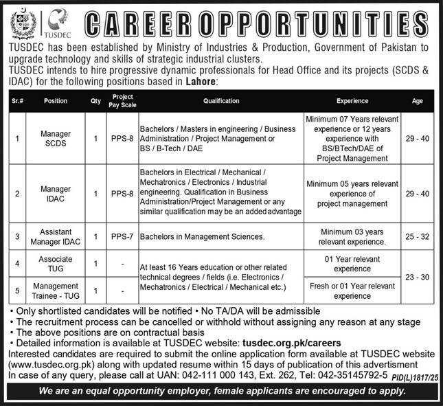 Ministry of Industries and Manufacturing jobs commercial dated about 5 January 2026 in each day Categorical Newspaper invitations utility for the vacant publish of supervisor idac, affiliate tug, administration trainee tug, assistant supervisor idac and supervisor scds in Lahore, lahore Punjab Pakistan. Individuals with Grasp and Bachelor and so on. training can apply.