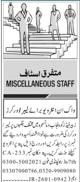 Vacant posts together with employee and labor are introduced in Zubair Feeds Personal Restricted seventh Highway Rawalpindi, rawalpindi Punjab Pakistan as per 17 February 2026 commercial in every day Jang Newspaper. Individuals with Center and Matric and so on. schooling can apply.