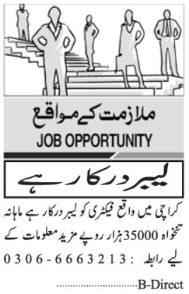 Newest Personal Manufacturing facility Labor Posts Karachi 2026