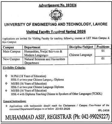 The Lecturers Jobs in Lahore March 2026 Commercial has been introduced by the College of Engineering and Know-how Lahore (UET Lahore) by way of Commercial No. 10/2026 for Visiting College positions for Spring 2026. The college is inviting functions from certified candidates to show Chinese language Language programs on the Predominant Campus and New Campus in Lahore. Candidates with related tutorial {qualifications} and acknowledged Chinese language language certifications similar to HSK-4 or HSK-5 together with educating credentials are inspired to use. This chance is right for professionals who want to contribute to increased schooling by educating trendy languages and humanities topics at one among Pakistan’s main engineering universities.