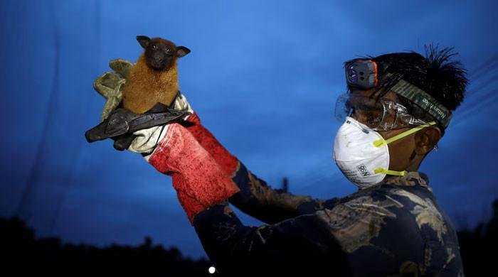 A area lab assistant holds up a bat after catching it in a internet to gather specimens for Nipah virus analysis within the Shuvarampur space of Faridpur, Bangladesh, September 14, 2021. — Reuters