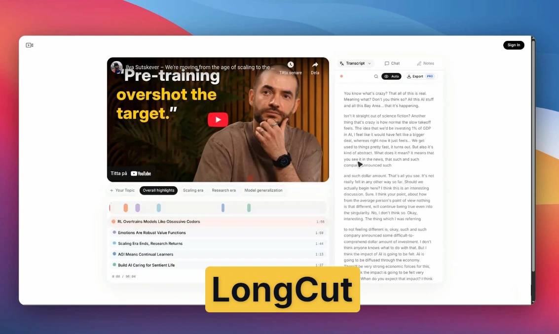 LongCut är ett sensible AI-verktyg som löser ett av internets största downside nämligen alldeles för långa videor. Istället för att sitta igenom en timmes tutorial eller föreläsning får du ut de viktigaste delarna på bara några minuter.