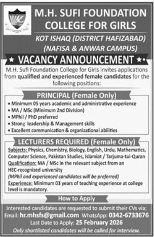 Lahore jobs 2026 MH Sufi Foundation College for Girls