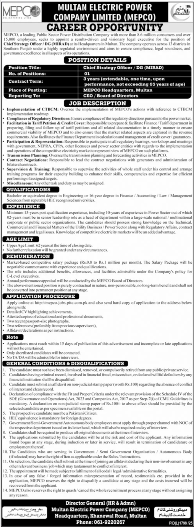 Multan Electrical Energy Firm MEPCO invitations functions for job positions marketed in each day Jang dated 4 January 2026 for following vacancies in Lahore, lahore Punjab Pakistan.