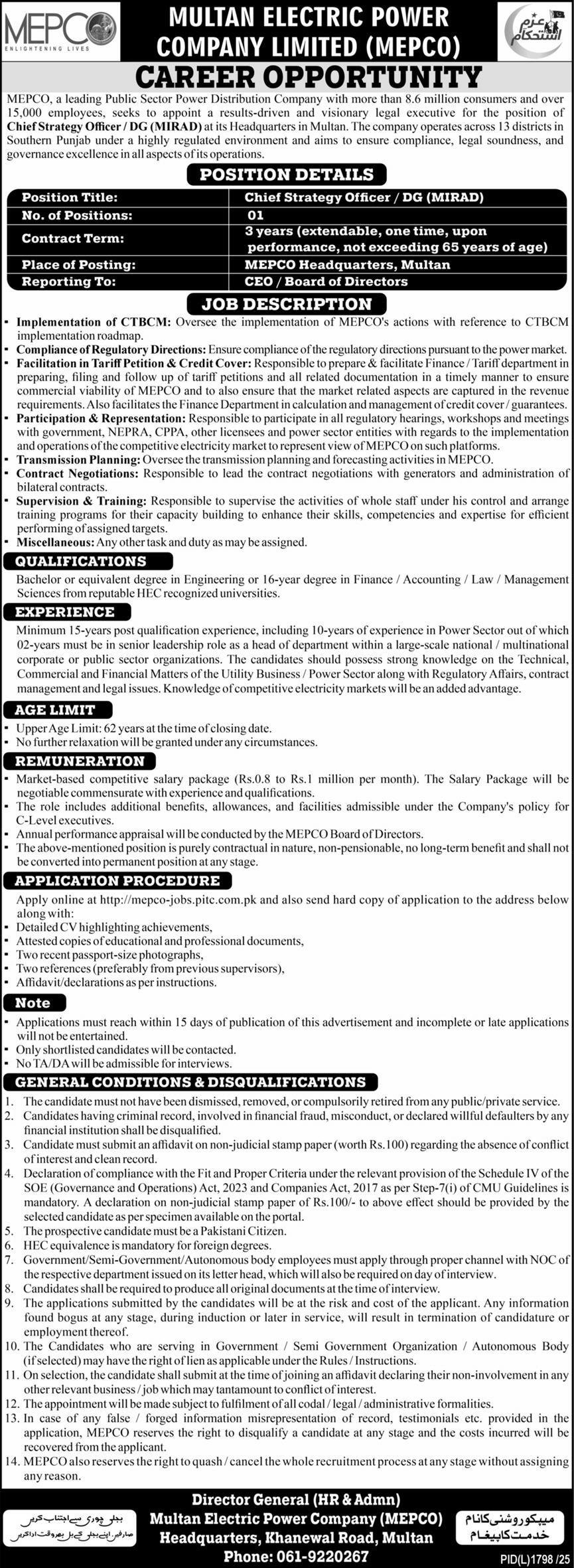 Vacant posts together with chief technique officer are introduced in Multan Electrical Energy Firm MEPCO Khanewal Street Multan, multan Punjab Pakistan as per 3 January 2026 commercial in day by day Specific Newspaper. Most well-liked Schooling is Bachelor and Grasp and so forth.