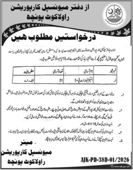 Vacant posts together with inspector tajazwat and inspector are introduced in Municipal Company Rawalakot, poonch AJK Pakistan as per 15 January 2026 commercial in every day Khabrain Newspaper. Individuals with Intermediate and so on. training can apply.
