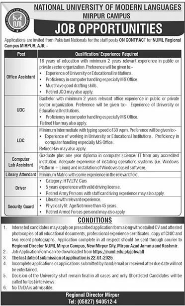 Nationwide College of Trendy Languages NUML jobs commercial dated about 8 January 2026 in each day The Information Newspaper invitations utility for the vacant put up of driver, udc, workplace assistant, ldc, library attendant, safety guard and pc lab assistant in Mirpur, mirpur AJK Pakistan. Candidates with MS, Bachelor, Matric, Intermediate and Grasp and many others. academic background might be most popular.