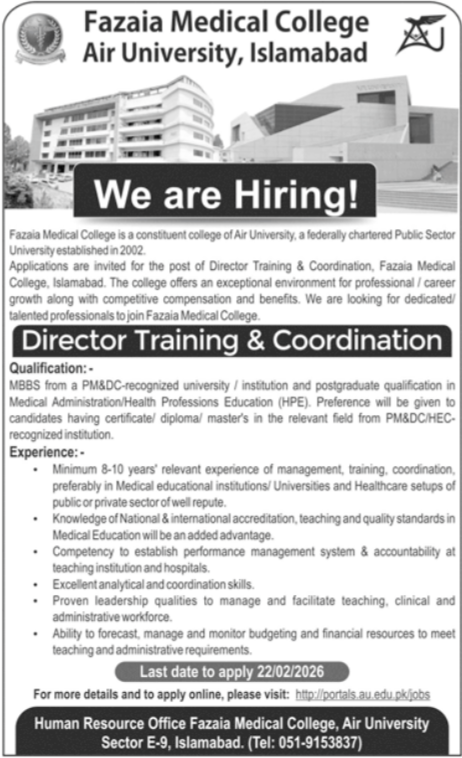 Vacant posts together with director coaching coordination are introduced in Fazaia Medical Faculty Islamabad, islamabad Islamabad Pakistan as per 8 February 2026 commercial in every day Jang Newspaper. Instructional {qualifications} required Bachelor, Grasp and MS and many others.