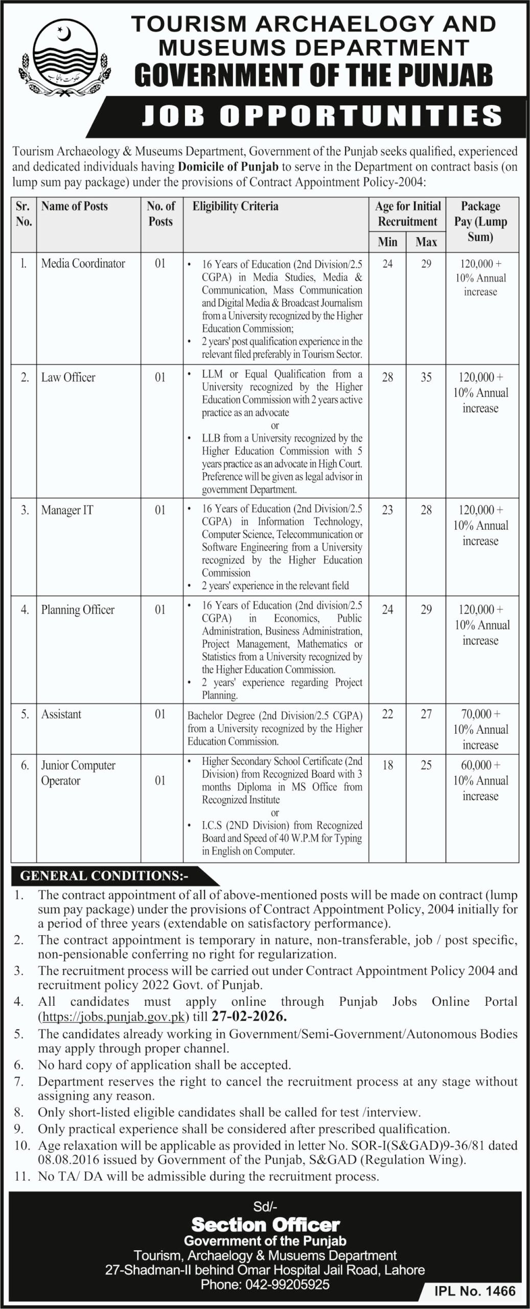 Tourism Archaeology & Museum Division is in search of candidates for following posts as per job commercial printed in each day Different Newspaper of February 12, 2026 for location Jail Street Lahore, lahore Punjab Pakistan: