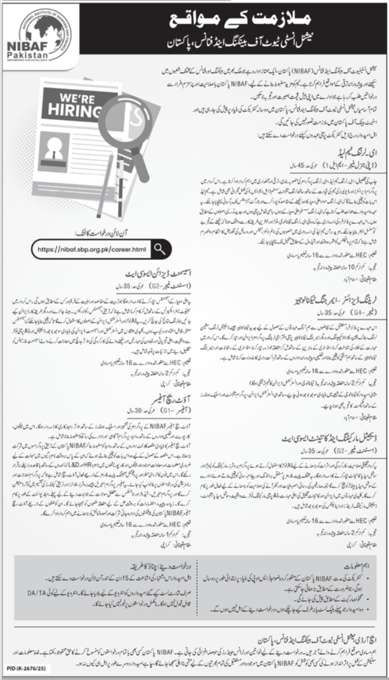 Vacant posts together with outreach officer, deputy common supervisor, assistant supervisor, e studying workforce lead, coaching designer, coaching designer rising applied sciences, supervisor, evaluation design affiliate, content material affiliate and digital advertising and marketing affiliate are introduced in Nationwide Institute of Banking & Finance NIBAF H-8 Islamabad, karachi Islamabad Pakistan as per 5 February 2026 commercial in each day Jang Newspaper. Candidates with M.sc, Grasp, MS, Others and MA and so forth. academic background will probably be most well-liked.