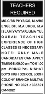 Nishat Boys Excessive College invitations functions for job positions marketed in every day Nawaiwaqt dated 1 January 2026 for following vacancies in Lodhi Colony Multan, multan Punjab Pakistan.
