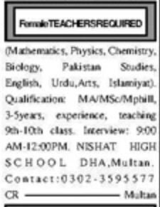 Vacant posts together with physics trainer, english trainer, islamiyat trainer, biology trainer, urdu trainer, chemistry trainer, arithmetic trainer, trainer, arts trainer and pakistan research trainer are introduced in Nishat Excessive Faculty DHA Defence Multan, multan Punjab Pakistan as per 15 January 2026 commercial in each day Khabrain Newspaper. Academic {qualifications} required Mphil, M.sc and MA and so forth.