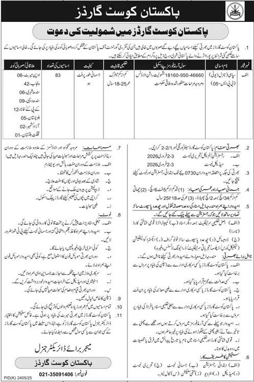 | Recruitment Location | Pakistan Coast Guards Heart No. 22, Karachi |