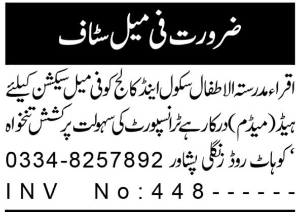 Iqra Madrassa Tul Atfal Faculty & Faculty invitations purposes for job positions marketed in each day Aaj dated 27 December 2025 for following vacancies in Kohat Highway Peshawar, peshawar Khyber Pakhtunkhwa KPK Pakistan.