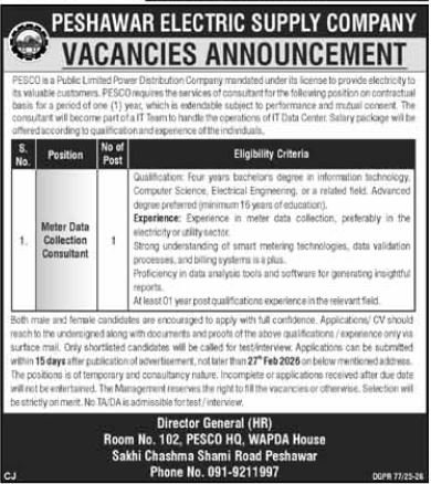 Peshawar Electrical Provide Firm PESCO invitations functions for job positions marketed in each day Mashriq dated 13 February 2026 for following vacancies in Shami Street Peshawar, peshawar Khyber Pakhtunkhwa KPK Pakistan.