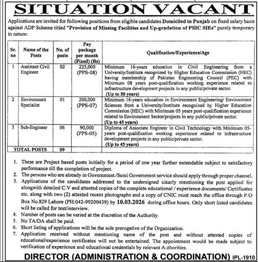 A Public Sector Organization in Punjab has announced new job opportunities in February 2026 under an ADP development scheme titled “Provision of Missing Facilities and Up-gradation of PSIC SIES”. Applications are invited from eligible candidates domiciled in Punjab for multiple engineering and technical positions on a fixed-salary, project-based, and purely temporary basis. These roles offer attractive pay packages under the PPS scale, providing a valuable opportunity for experienced professionals to contribute to important infrastructure and environmental development projects in the province.