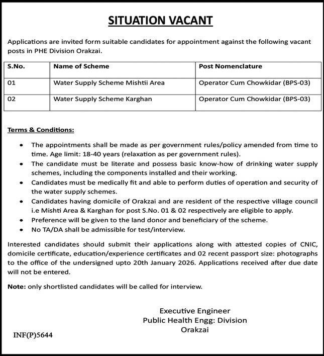 Public Well being Engineering Division is on the lookout for candidates for following posts as per job commercial revealed in day by day Categorical Newspaper of January 3, 2026 for location Orakzai, orakzai Khyber Pakhtunkhwa KPK Pakistan:
