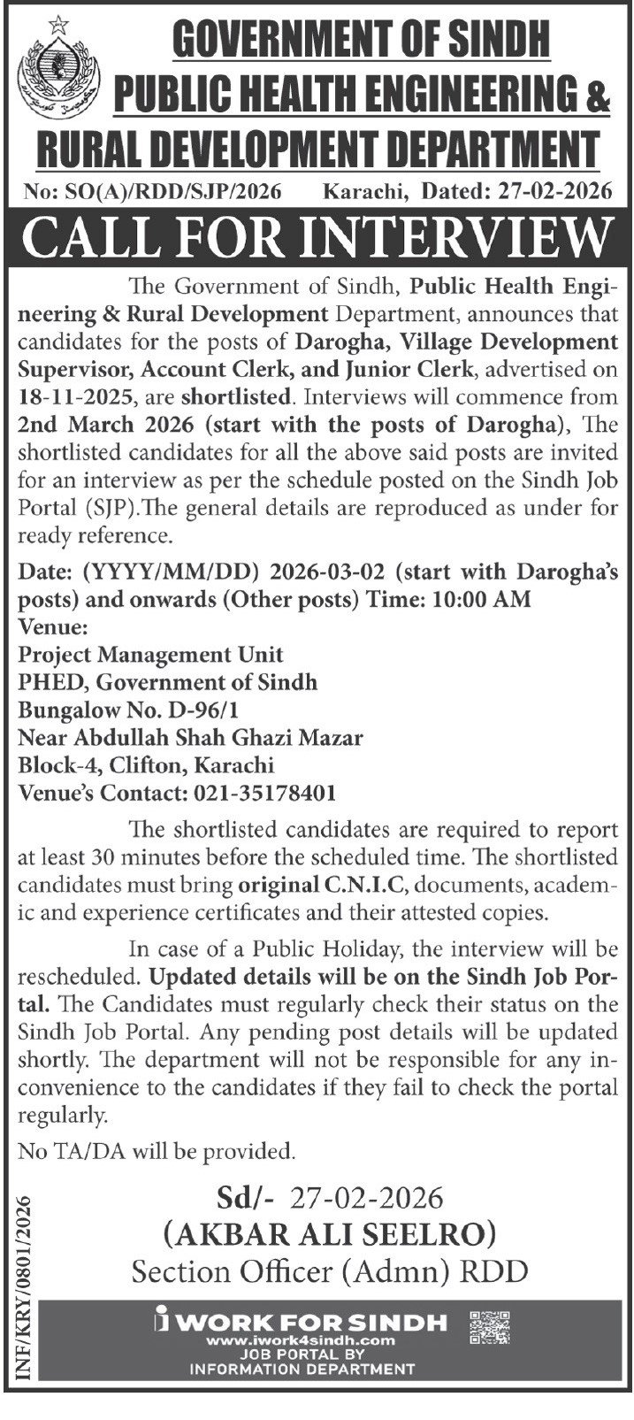 Public Well being Engineering Division invitations functions for job positions marketed in day by day Different dated 28 February 2026 for following vacancies in Karachi, karachi Sindh Pakistan.