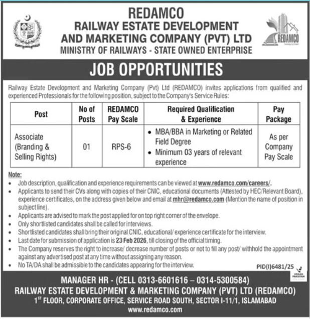 Railway Property Improvement & Advertising Firm Pvt Ltd REDMC I-11/1 Islamabad, islamabad Islamabad Pakistan invitations purposes from eligible candidates for the publish of affiliate branding promoting rights as per commercial of February 11, 2026 printed in day by day Jang Newspaper. Instructional {qualifications} required MBA, Bachelor, Grasp and BBA and many others.