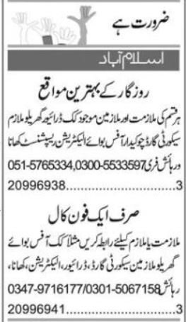 Personal Firm Islamabad, islamabad Islamabad Pakistan invitations purposes from eligible candidates for the put up of prepare dinner, chowkidar, workplace boy, driver, receptionist, home employee, electrician and safety guard as per commercial of December 31, 2025 printed in each day Specific Newspaper. Intermediate, Matric, Bachelor and Center and many others. instructional qualification will probably be most well-liked.