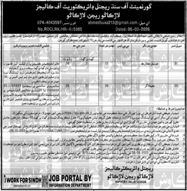 2026 jobs Pakistan job advertisement Regional Directorate of Colleges Larkana