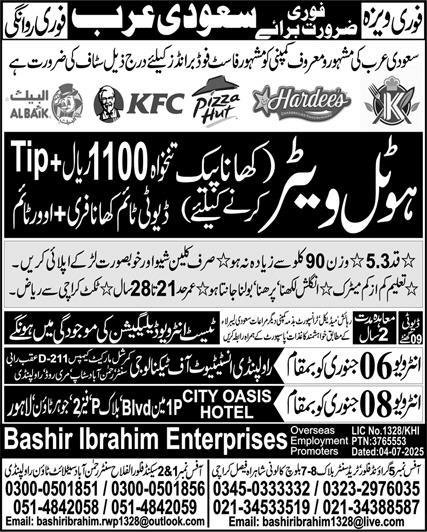 Vacant posts together with lodge waiter are introduced in Bashir Ibrahim Enterprises Riyadh, riyadh Saudi Arabia as per 5 January 2026 commercial in day by day Categorical Newspaper. Candidates with Center and so on. instructional background will probably be most well-liked.
