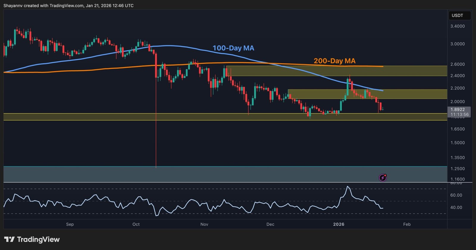 On the XRP/USDT pair, the sharp rejection from the $2.40 resistance block and the declining 100-day and 200-day shifting averages have pushed the worth again in direction of the $1.80 demand zone, which has repeatedly acted as a serious horizontal assist.