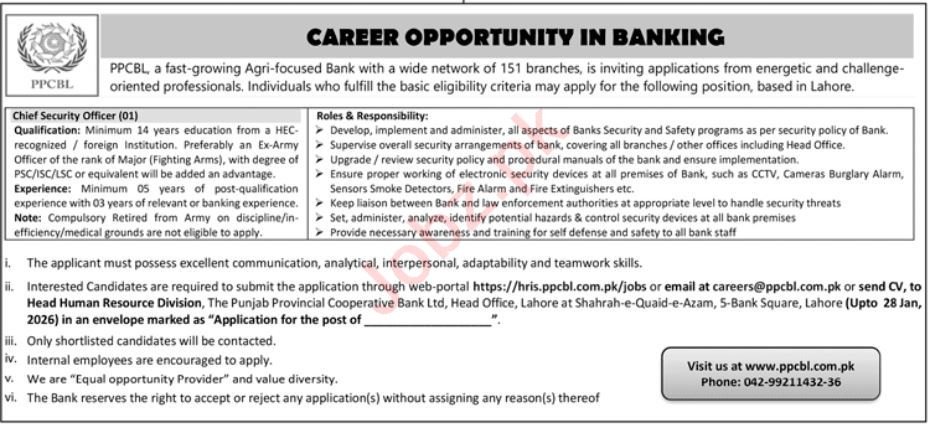 Vacant posts together with safety officer are introduced in The Punjab Provincial Cooperative Financial institution Ltd PPCBL Lahore, lahore Punjab Pakistan as per 21 January 2026 commercial in every day Jang Newspaper. Most well-liked Training is Grasp and Bachelor and so on.