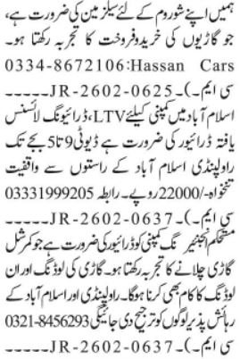 Non-public Firm Islamabad, rawalpindi Islamabad Pakistan invitations purposes from eligible candidates for the put up of driver, salesman and ltv driver as per commercial of February 24, 2026 revealed in each day Jang Newspaper. Individuals with Matric, Center, Intermediate and Major and many others. training can apply.