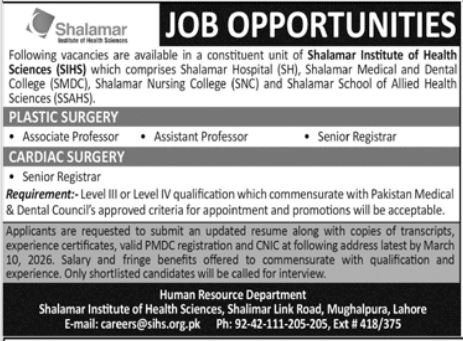 Shalamar Institute of Well being Sciences jobs commercial dated about 2 March 2026 in each day Jang Newspaper invitations software for the vacant submit of affiliate professor, registrar and assistant professor in Mughalpura Lahore, lahore Punjab Pakistan. Candidates with Grasp, Mphil, Phd and Bachelor and so on. academic background will likely be most well-liked.