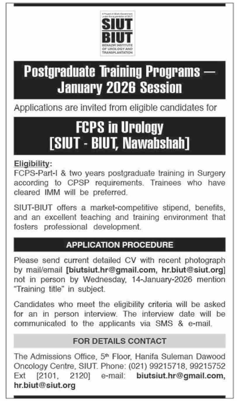 Sindh Institute of Urology and Transplantation SIUT is in search of candidates for following posts as per job commercial printed in each day Daybreak Newspaper of January 6, 2026 for location Karachi, karachi Sindh Pakistan: