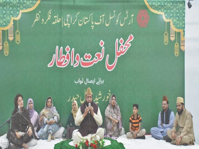 Arts Council of Pakistan Karachi, in collaboration with Halqa-e-Fikr-o-Nazar, organized a spiritually uplifting “Mehfil-e-Naat and Iftar for the Esal-e-Sawab of Khurshid Iqbal Haider” on the Haseena Moin Corridor, Ahmed Shah Constructing.