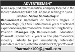 Vacant posts together with supervisor qa and sr microbiologist are introduced in Pharmaceutical Firm Kot Lakhpat Lahore, lahore Punjab Pakistan as per 28 December 2025 commercial in day by day Jang Newspaper. Pharma D, M.sc, Bachelor and Grasp and so forth. instructional qualification might be most well-liked.