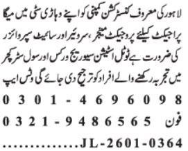 Development Firm is searching for candidates for following posts as per job commercial printed in each day Jang Newspaper of January 14, 2026 for location Lahore, lahore Punjab Pakistan: