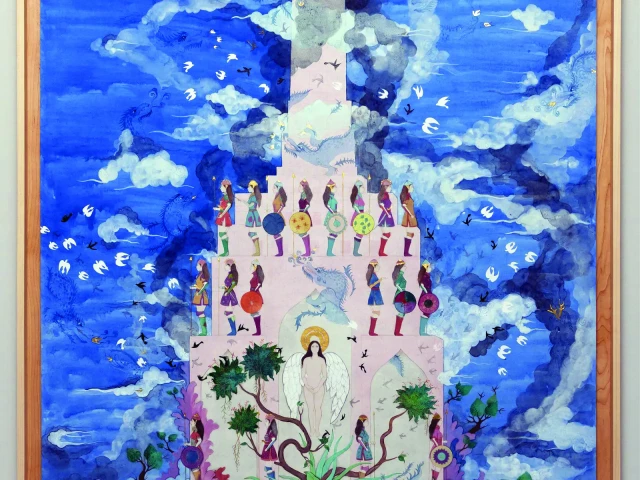 On the coronary heart of the exhibition is 'The Guard (2015-2025)', a luminous miniature portray the place a nude angel rises by rose-coloured partitions surrounded by delicate dragons exhaling trails of gold. Round her, a court docket of feminine guards stands watch in solemn symmetry, their gaze regular, their presence protecting.