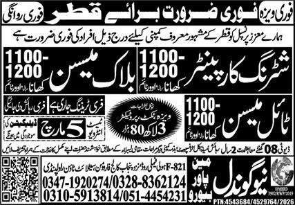 New Gondal Manpower Bureau Doha, doha Qatar invitations purposes from eligible candidates for the submit of shuttering carpenter, tile mason, mason and block mason as per commercial of March 3, 2026 printed in each day Specific Newspaper. Instructional {qualifications} required Intermediate and Matric and many others.