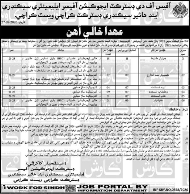 Vacant posts together with store assistant, lab assistant, pc lab incharge, cashier, junior clerk, workshop assistant and clerk are introduced in College Training & Literacy Division Karachi, karachi Sindh Pakistan as per 4 March 2026 commercial in each day Kawish Newspaper. Academic {qualifications} required Others, Intermediate, DAE and Bachelor and many others.