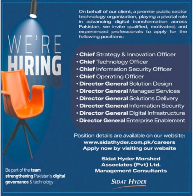 Sidat Hyder Morshed Associates Islamabad, islamabad Islamabad Pakistan invitations purposes from eligible candidates for the put up of Chief Working Officer, Chief Know-how Officer Cto, Chief Data Safety Officer, Director Basic Options Supply, Chief Technique Innovation Officer, Director Basic Enterprise Enablement, Director Basic Answer Design, Director Basic Managed Providers, Director Basic Data Safety and Director Basic Digital Infrastructure as per commercial of January 13, 2026 revealed in day by day Jang Newspaper. Candidates with Bachelor and Grasp and many others. academic background can be most well-liked.
