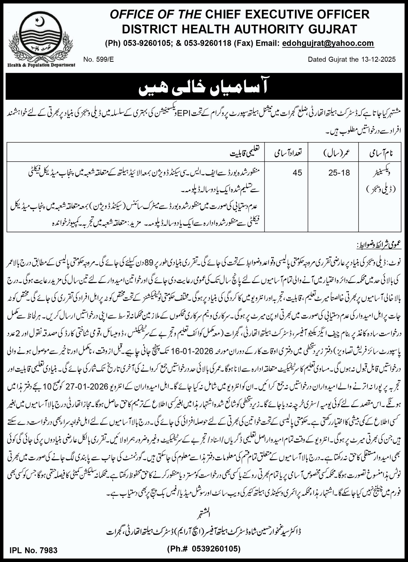 District Well being Authority Gujrat, gujrat Punjab Pakistan invitations purposes from eligible candidates for the put up of vaccinator as per commercial of December 27, 2025 revealed in day by day Different Newspaper. Intermediate and so on. academic qualification will probably be most popular.