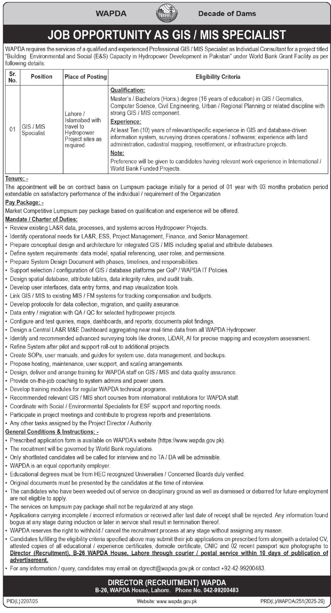 Water and Energy Growth Authority WAPDA jobs commercial dated about 13 February 2026 in each day Categorical Tribune Newspaper invitations software for the vacant publish of gis specialist and mis specialist in Wapda Colony Lahore, lahore Punjab Pakistan. Candidates with Bachelor and Grasp and so forth. academic background will probably be most well-liked.