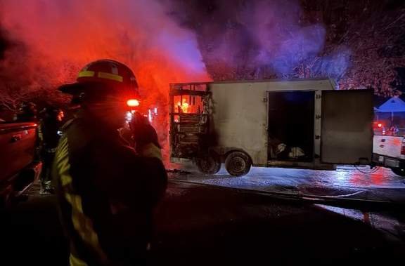 He says that arriving crews discovered a truck and trailer on fireplace, with fireplace coming near the home.